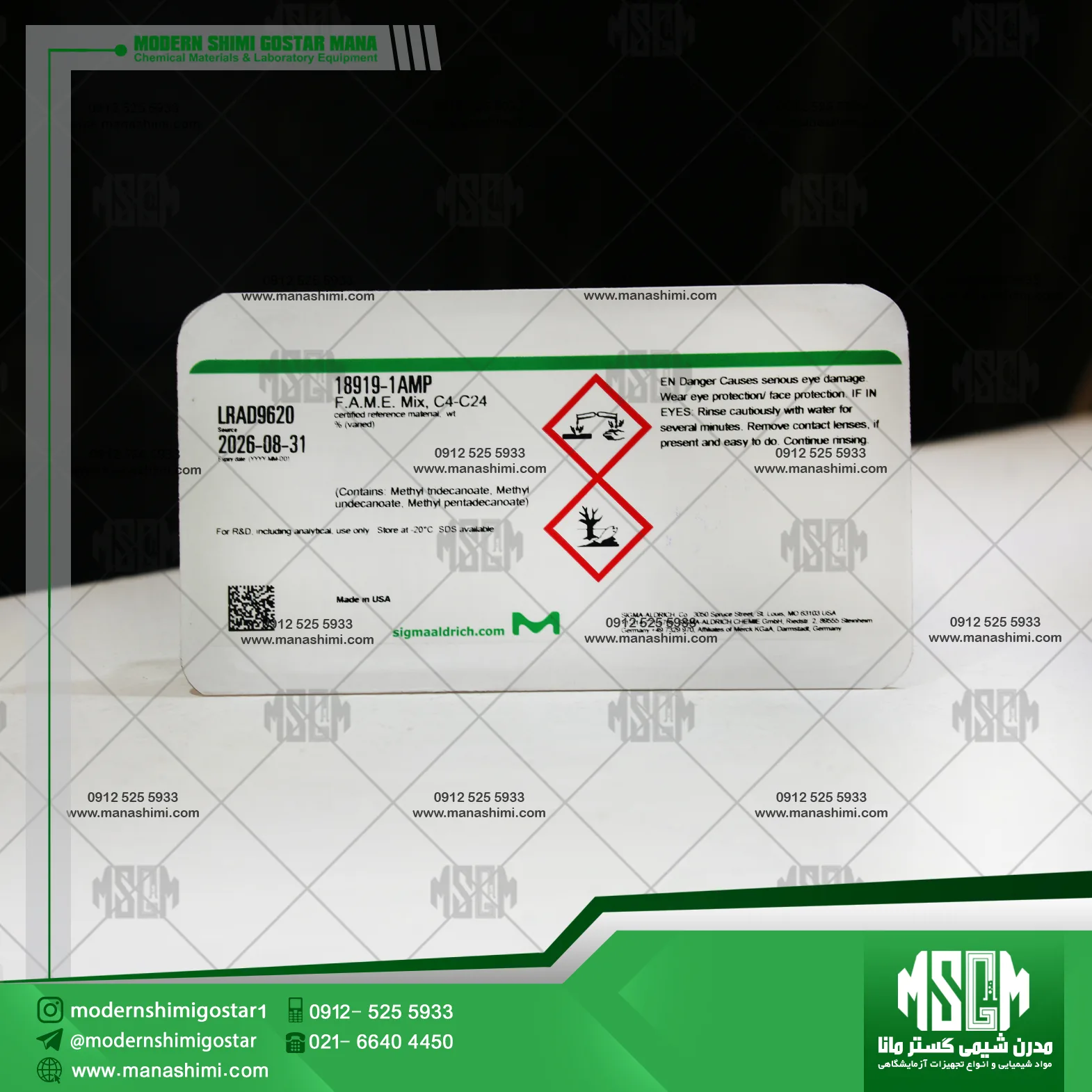 ماده شیمیایی میکس استاندارد اسید چرب کد ۱۸۹۱۹ F.A.M.E. Mix C4-C24 یک ترکیب از متیل استرهای اسیدهای چرب است که شامل ۳۷ نوع مختلف از این متیل استرها میشود. این ماده به طور خاص برای استفاده در آزمایشات و تحلیلهای شیمیایی طراحی شده است و در آن اسیدهای چرب با زنجیره کربنی بین ۴ تا ۲۴ کربن موجود است.